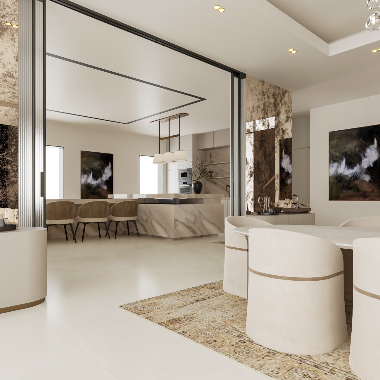 seamless material transitions, and a refined neutral palette enhanced through
