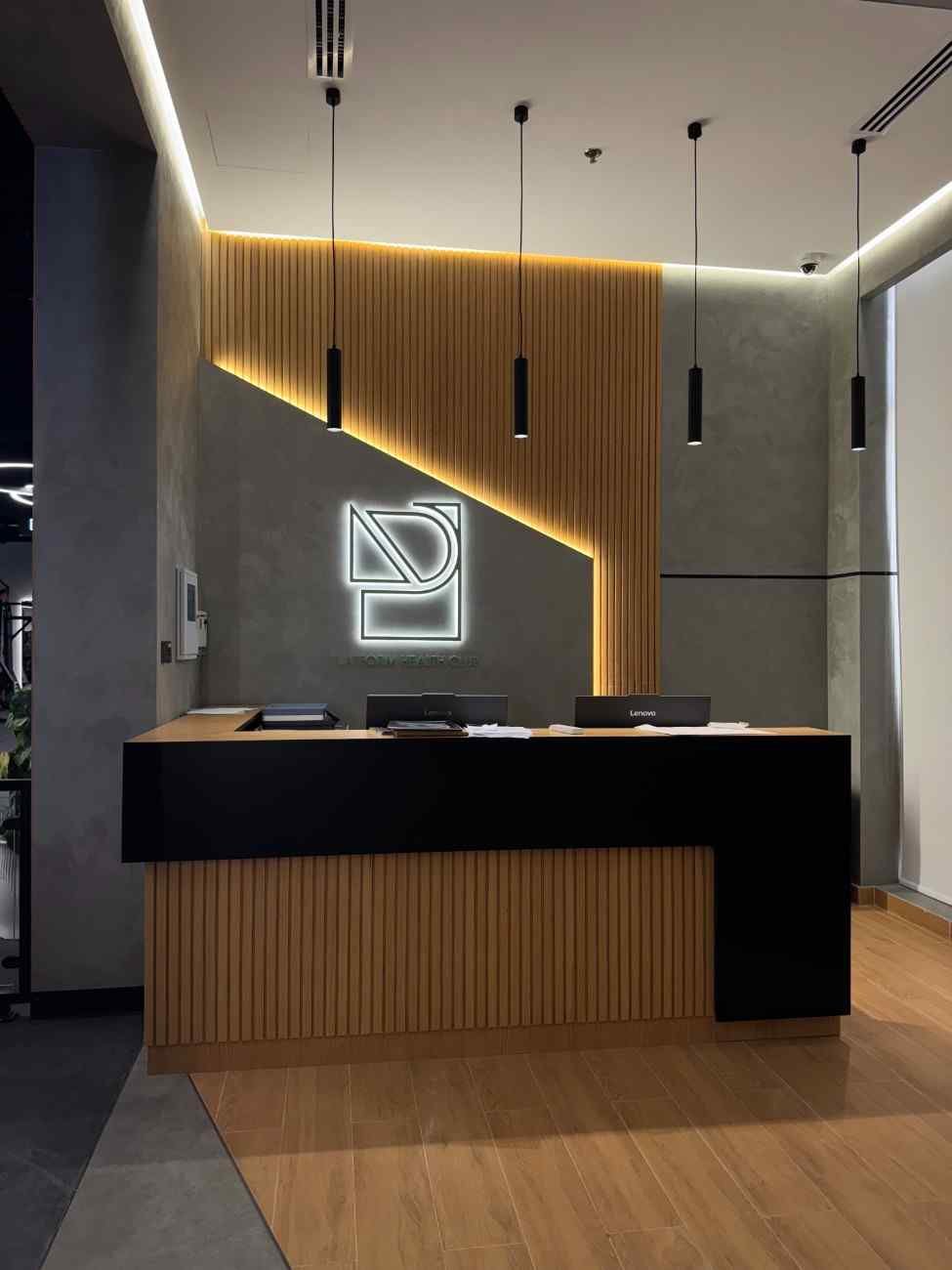 We paired dark, immersive surfaces with warm wood textures and sharp linear