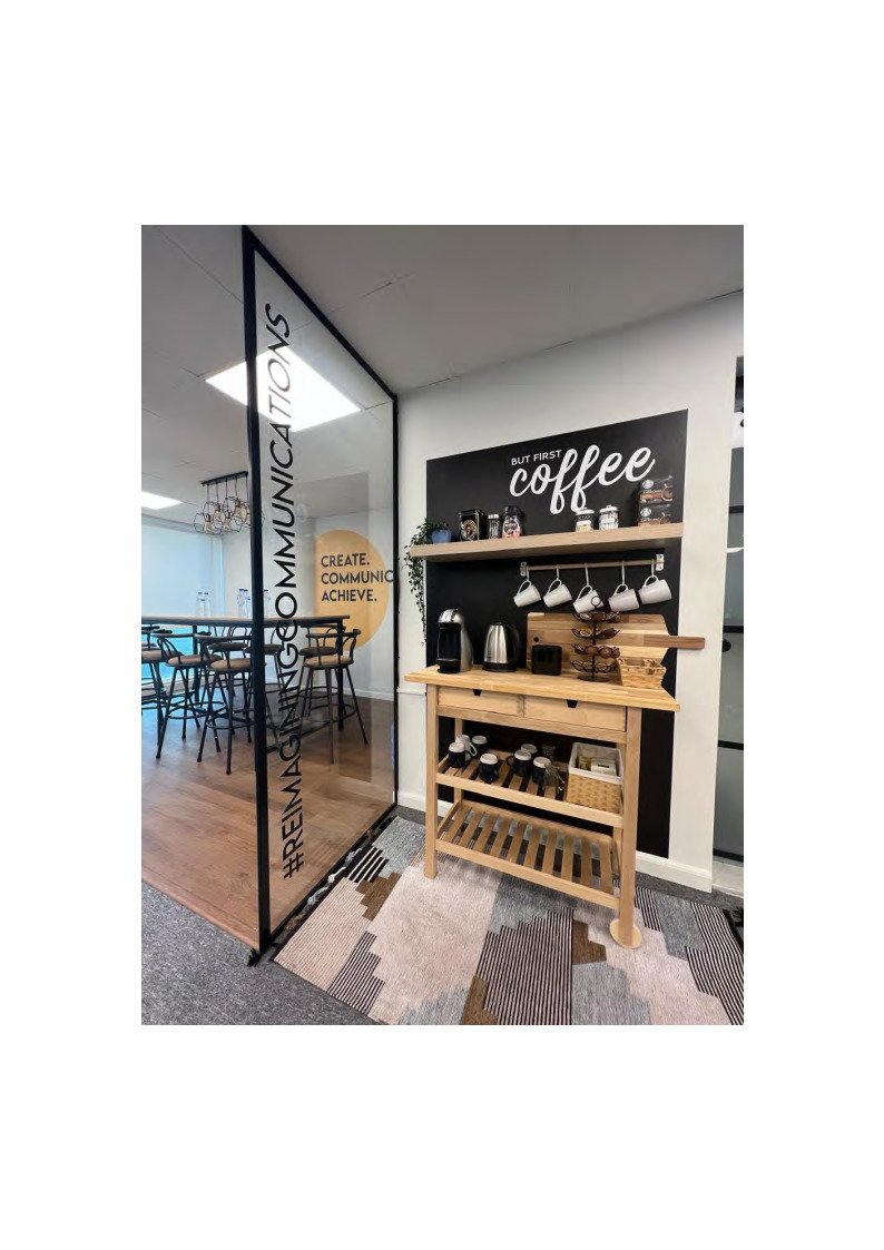 Warm wood finishes, soft seating, and bold brand graphics give the space