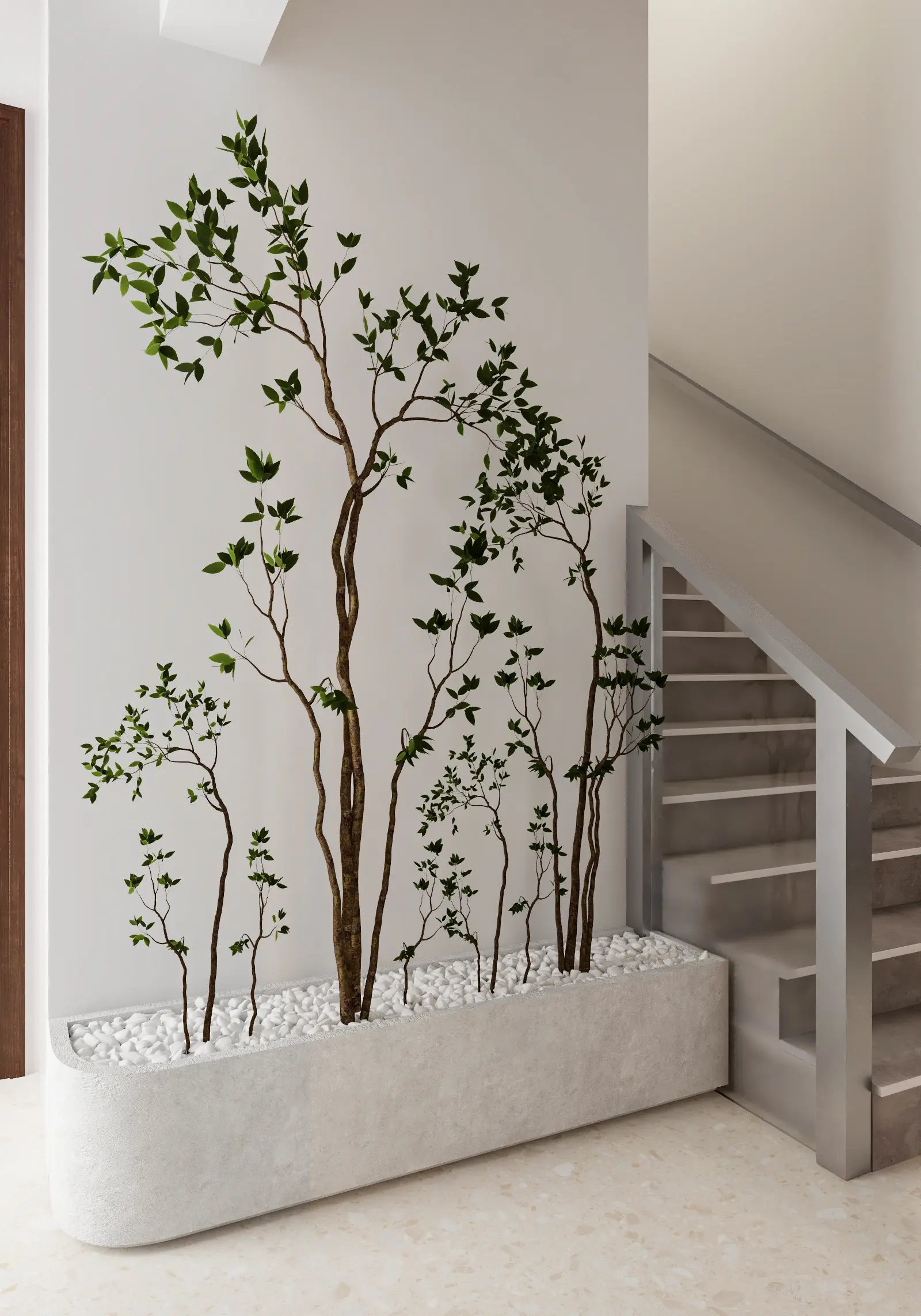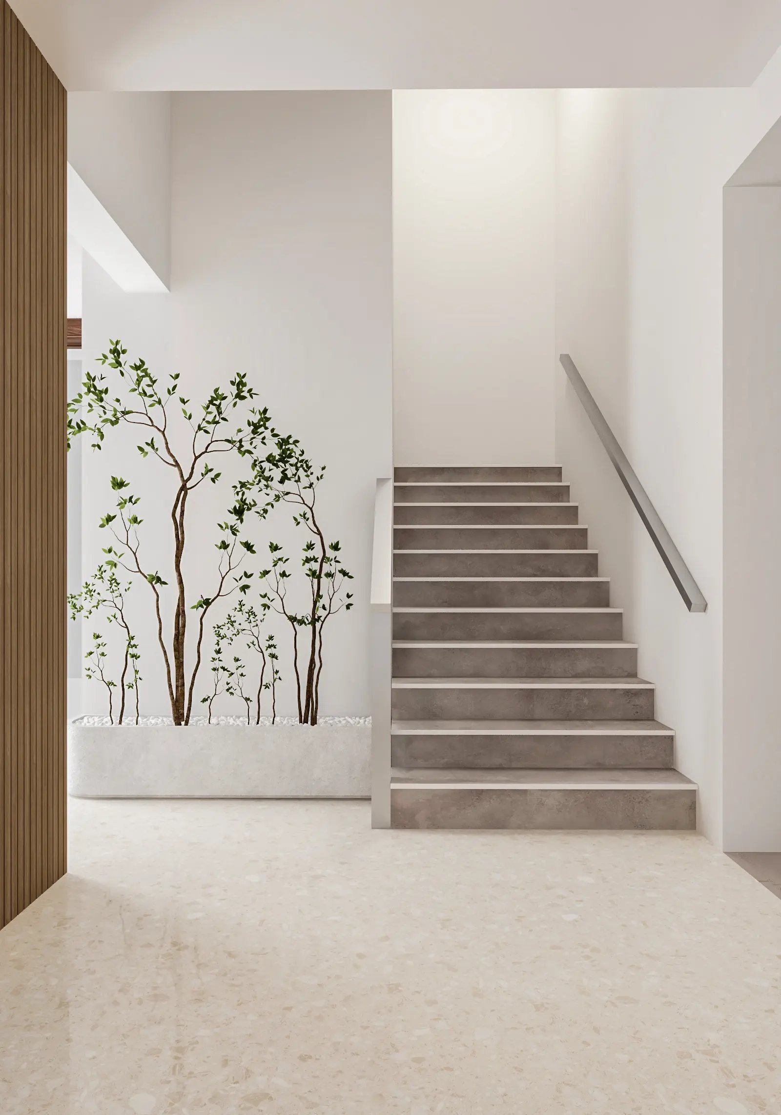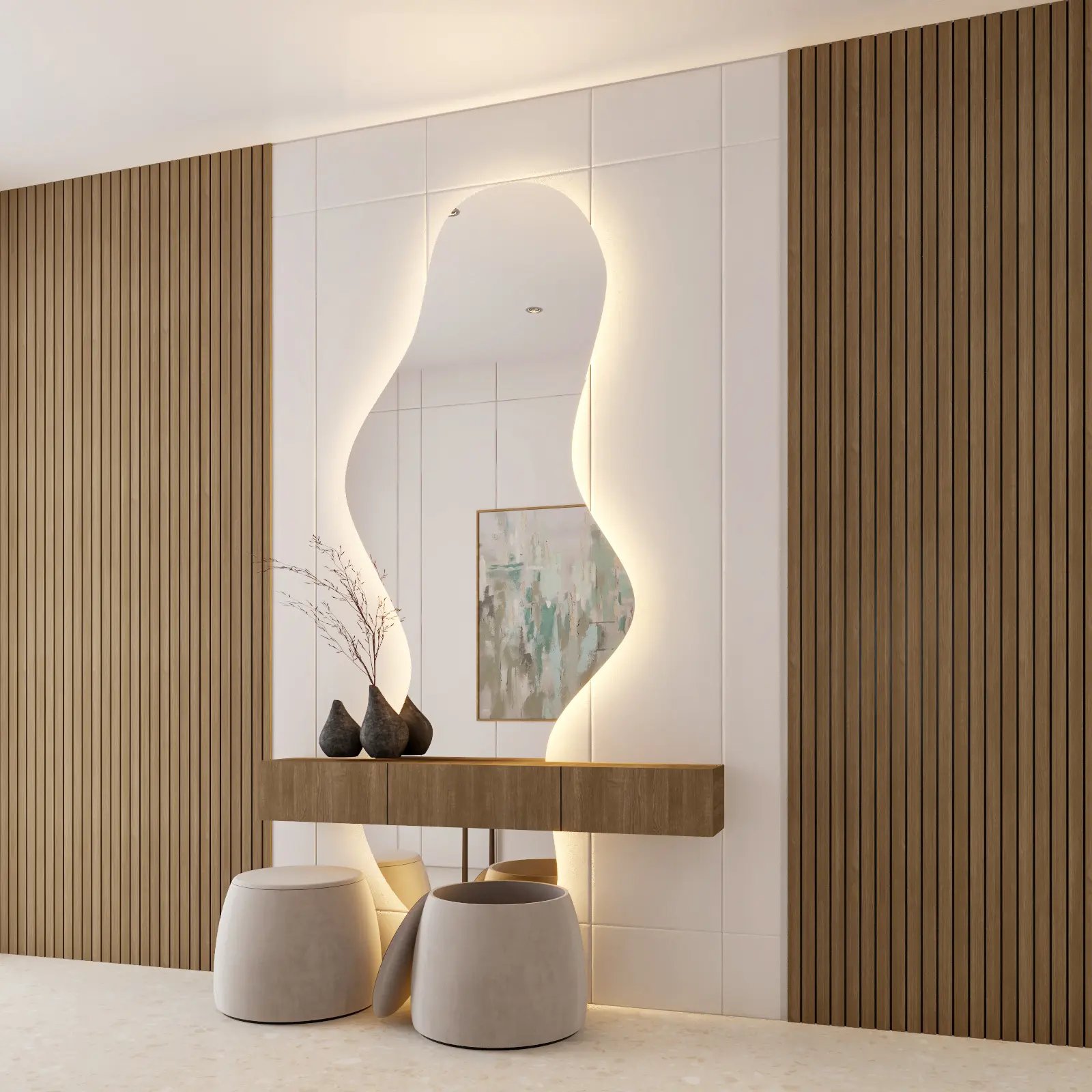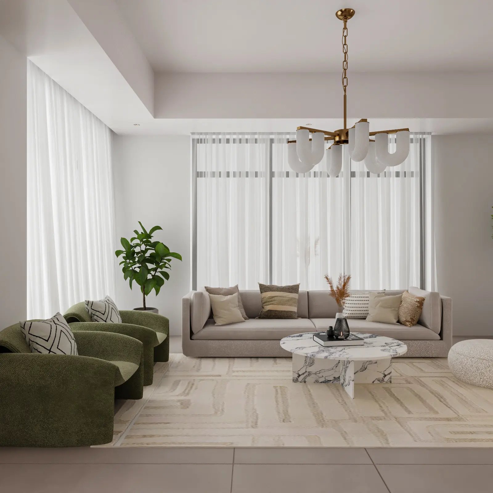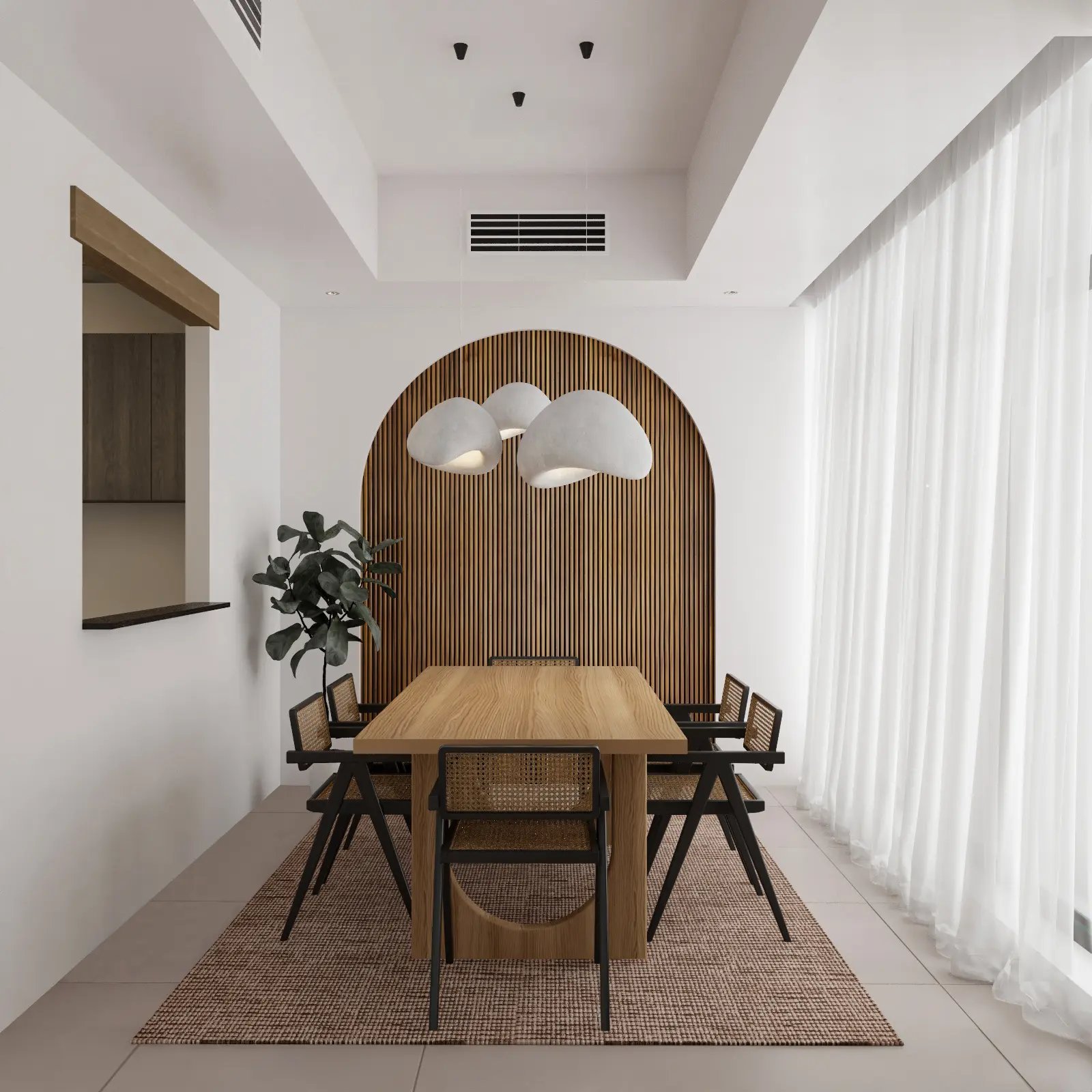 Step into a world of sophisticated minimalism, where natural textures and contemporary design merge seamlessly. This interior showcases an exquisite balance of warm wood tones, neutral palettes, and thoughtfully curated décor that enhances both functionality and aesthetic appeal. Welcoming yet refined, the entryway sets the tone with a curated mix of natural textures and contemporary art. A fluid-shaped backlit mirror becomes an artistic focal point, complemented by sleek paneling and a floating wooden console. A statement slatted wood accent wall with an arched design adds depth, while organic-shaped pendant lights cast a soft glow, creating an inviting atmosphere for gatherings in the dining area. An airy and inviting living room bathed in natural light, this space is designed for both relaxation and conversation. A neutral-toned sectional pairs effortlessly with deep green accent chairs, adding a pop of nature-inspired color. Each space in this interior is designed with a keen eye for detail, ensuring a seamless blend of modern aesthetics and timeless comfort