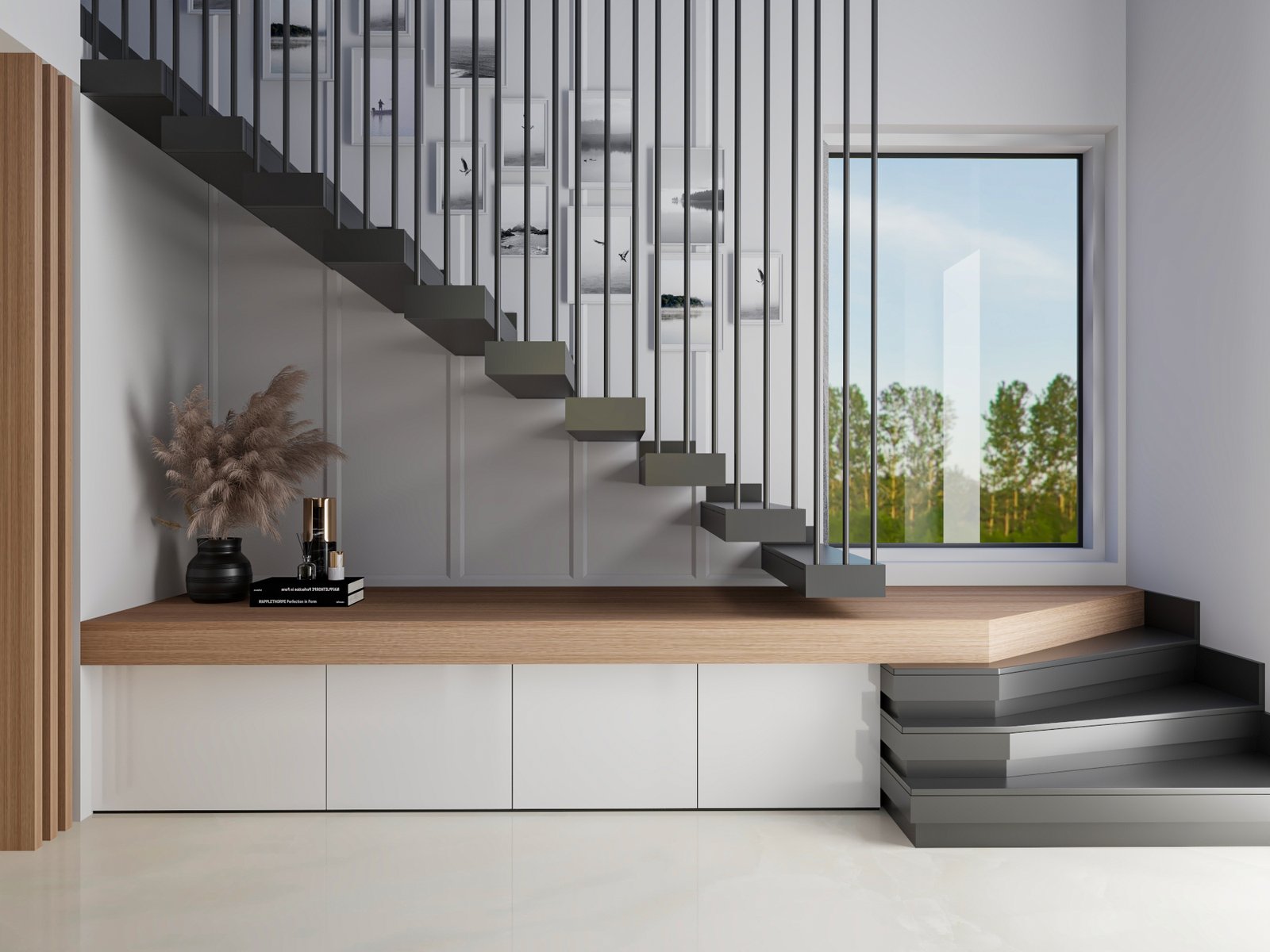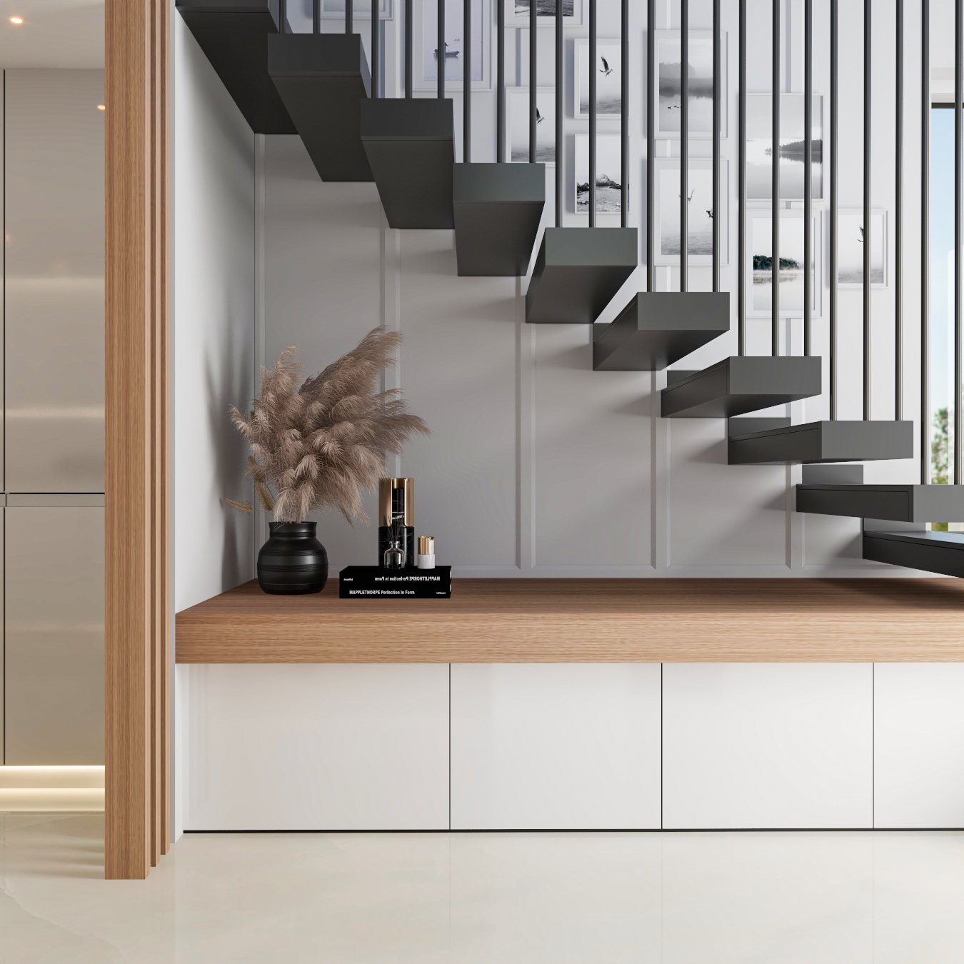 gentle material contrasts. A sculptural staircase becomes a quiet focal point,