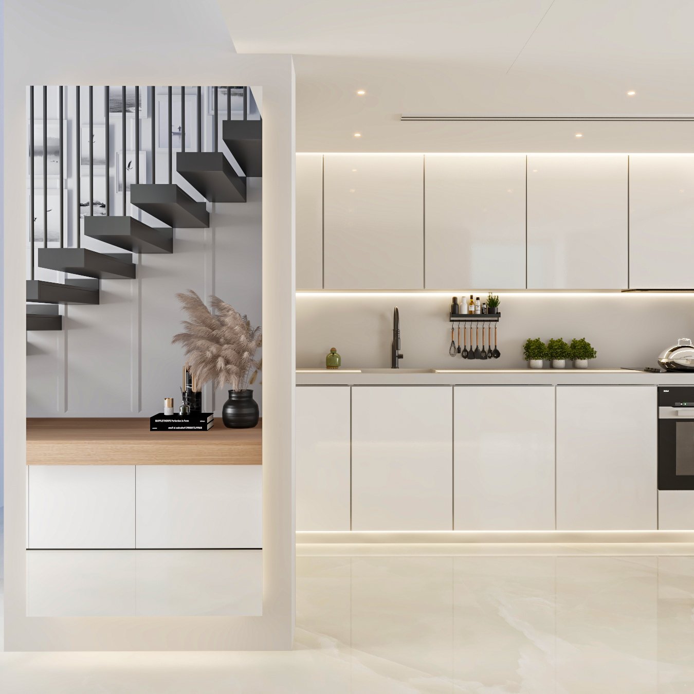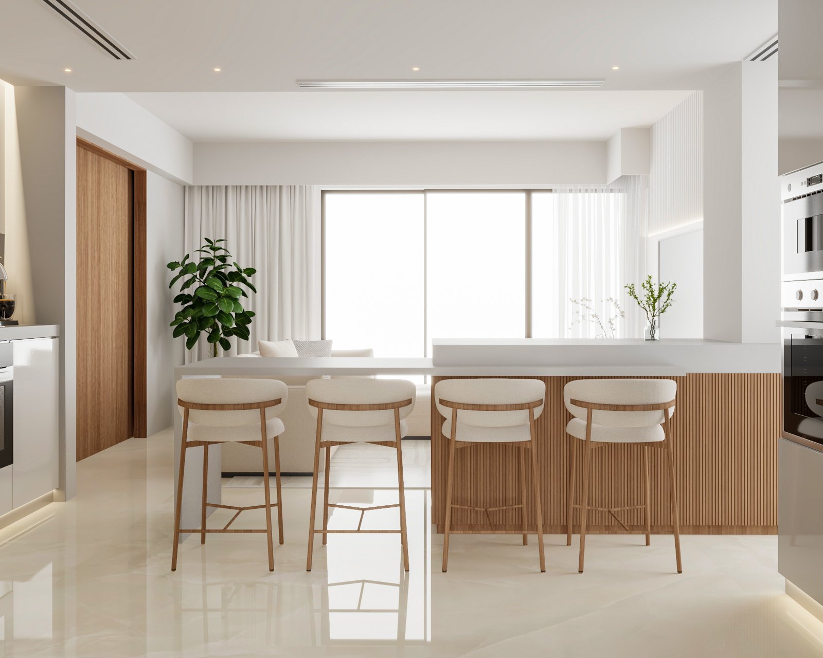 cabinetry, integrated appliances, and understated lighting create a calm,
