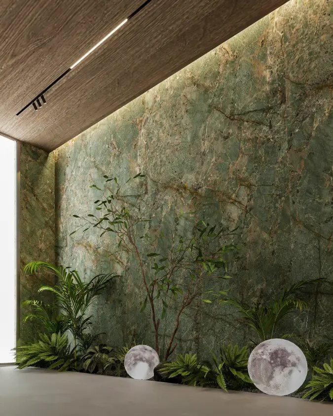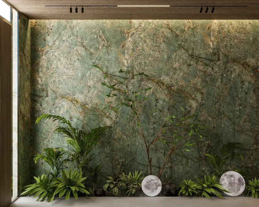 design harmonizes the green calm of marble with the earthy texture of the walls,