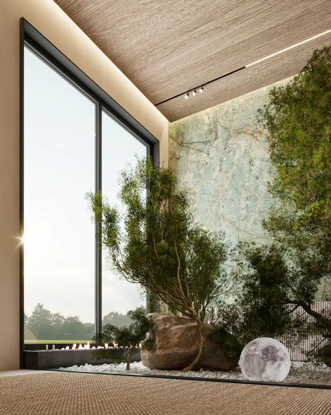 indirect lighting, biophilic elements, and organic materials transforms this space