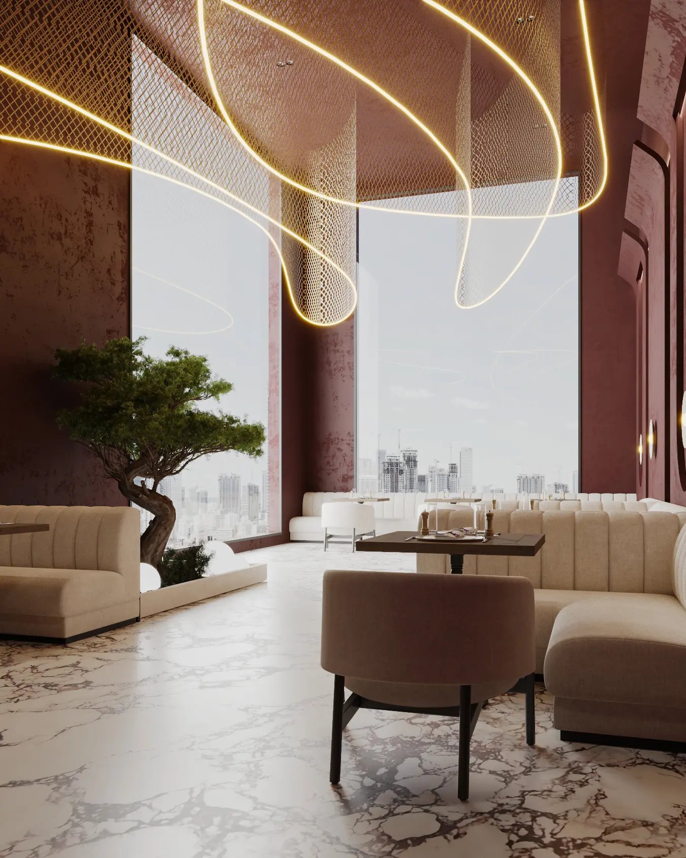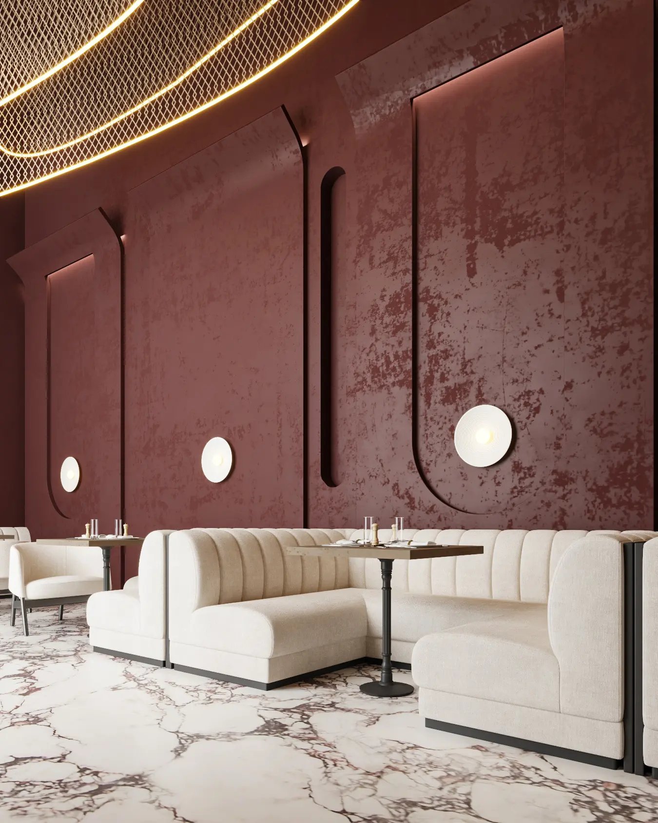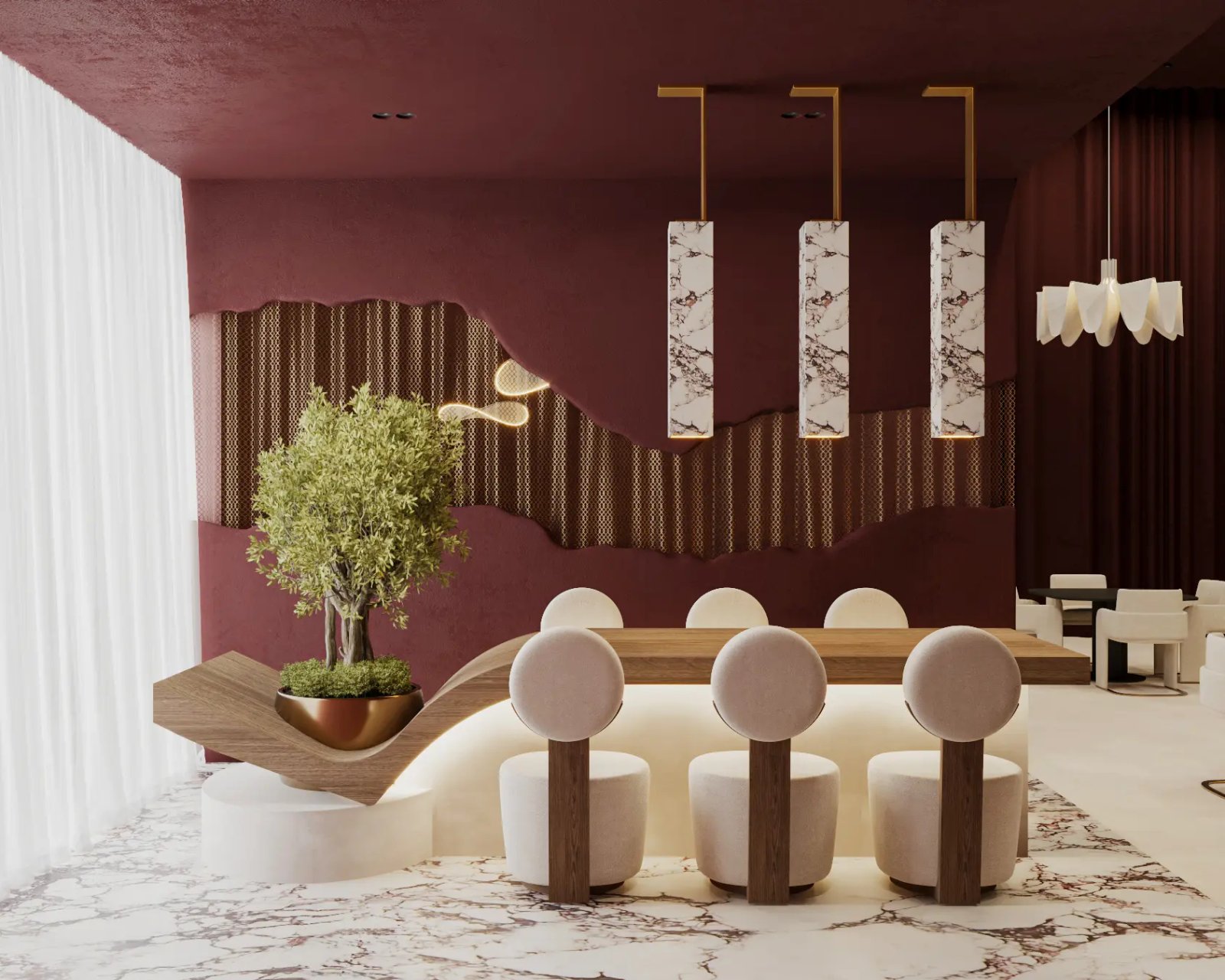 This restaurant gave us the perfect opportunity to play with materials and colours. The luxurious interior space features a harmonious blend of modern and organic elements, creating a warm and sophisticated atmosphere. The dominant color palette consists of rich burgundy hues, complemented by neutral tones of cream, wood, and marble accents. We have designed the dramatic feature wall which features an artistic undulating design with perforated metal details, adding elegance and intrigue. The overall atmosphere encourages cozy and relaxed dining moments with an opportunity to connect. The especially designed ceiling adds contrast and brings a feeling of lightness and fluidity to an otherwise dramatic space. It becomes a space which adds a poignant value to the entire dining experience.
