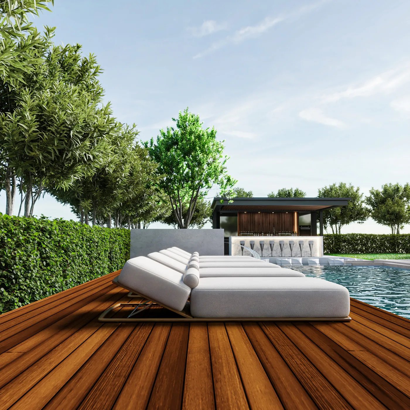 This landscape project is designed to redefine outdoor luxury with a serene and stylish poolside retreat. This beautiful outdoor space combines the best of nature and modern design to create a luxurious poolside retreat. The centerpiece is a stunning pool with a sleek waterfall, surrounded by elegant wooden decking and plush lounge seating. The area is nestled among lush greenery and neatly trimmed hedges, blending modern style with natural beauty. Soft lighting adds to the peaceful ambiance, making it ideal for relaxing during the day or enjoying gatherings in the evening. This project turns outdoor living into a masterpiece of comfort and sophistication.