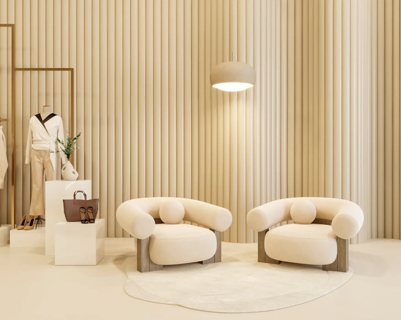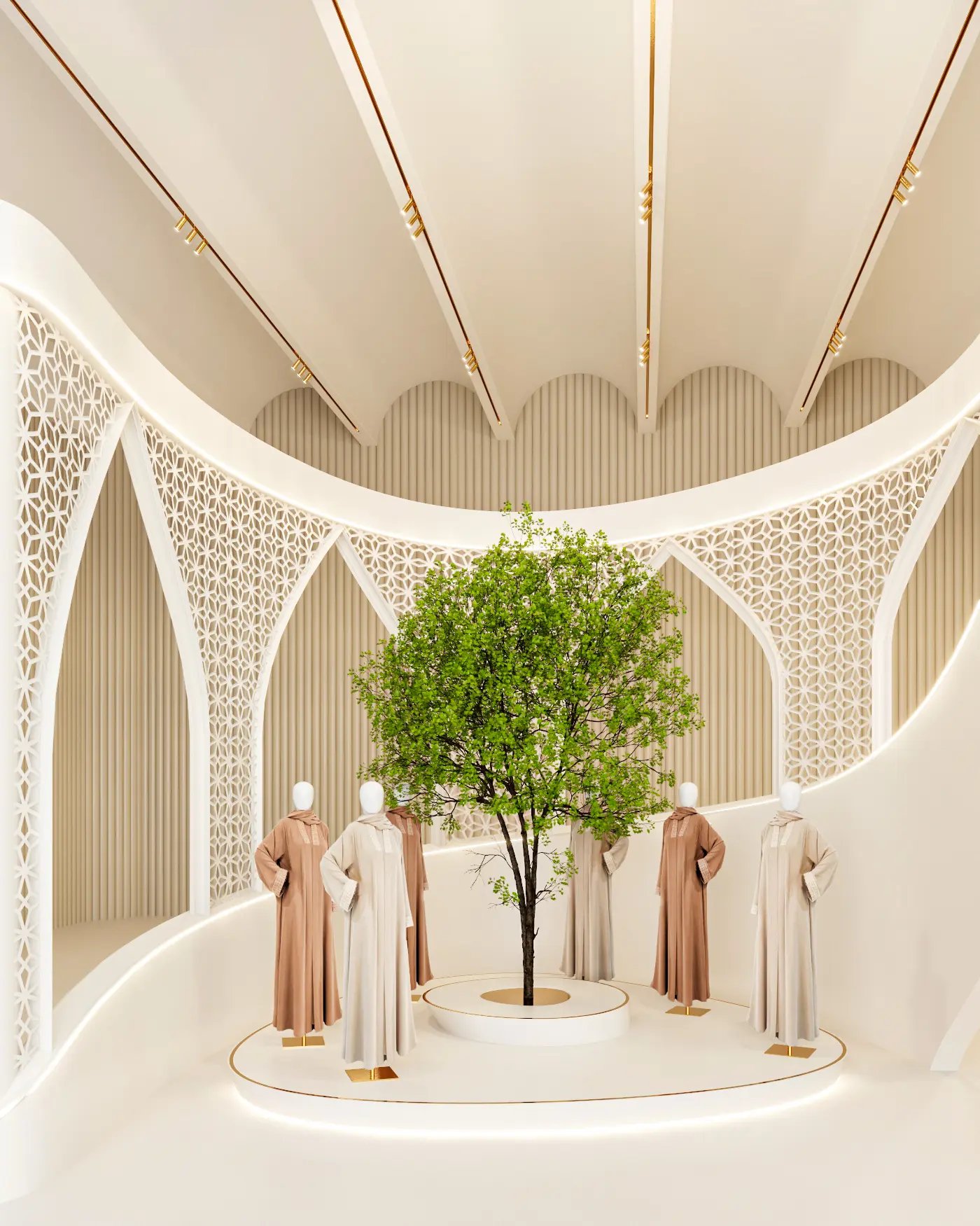 With this project, we step into a world where tradition meets modern elegance. This Neo-Arabic Abaya boutique was inspired by the timeless beauty of desert sands, blending graceful curves, intricate geometric patterns, and warm earthy tones to reflect Dubai’s rich heritage.At its heart stands the Ghaf tree, a symbol of resilience and peace, adding a touch of nature to this serene and luxurious space and the national tree of UAE. Thoughtfully designed with soft lighting, organic textures, and elegant arches, this boutique offers a truly immersive shopping experience. A space where culture, craftsmanship, and contemporary design come together beautifully.