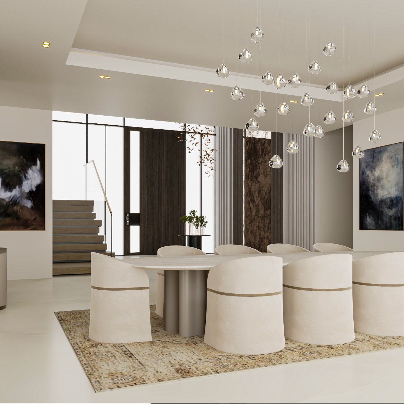 dining, kitchen, and powder areas. The design focuses on clean geometry,