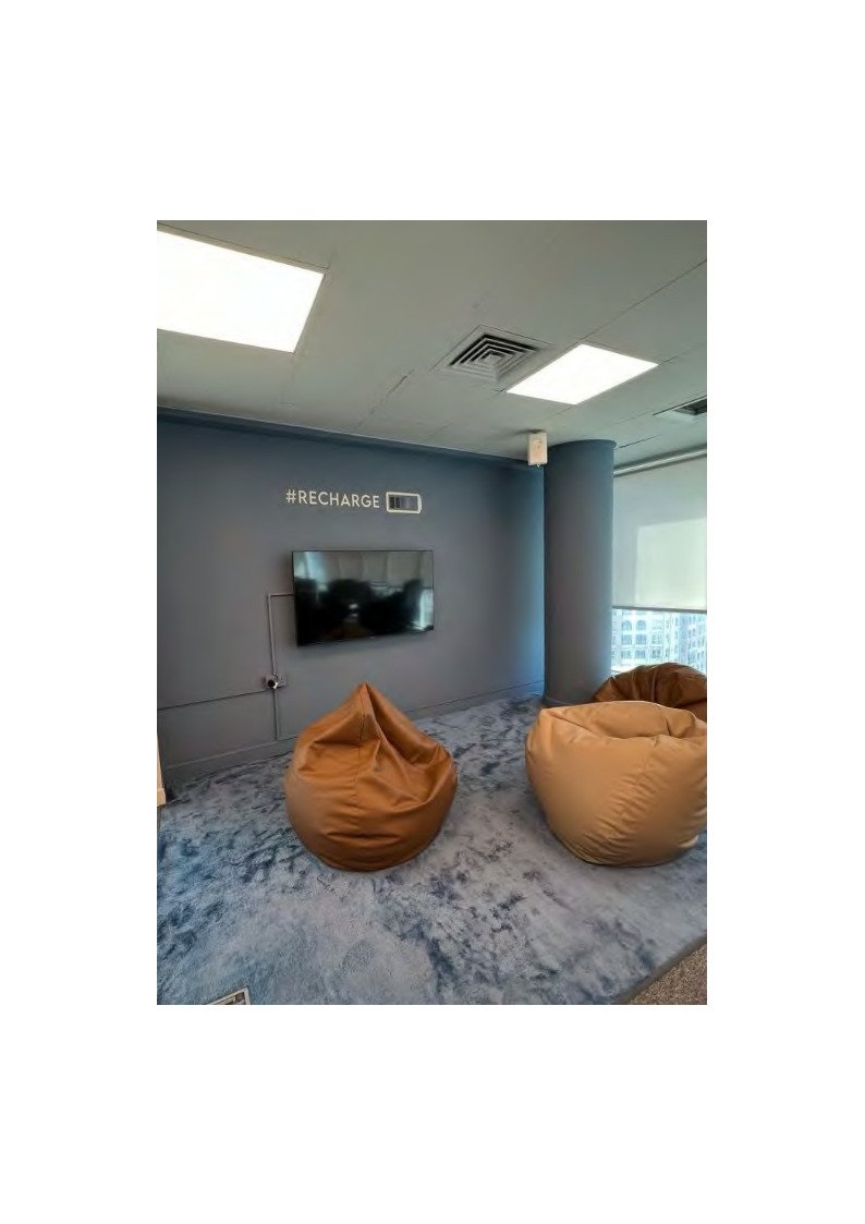 Warm wood finishes, soft seating, and bold brand graphics give the space