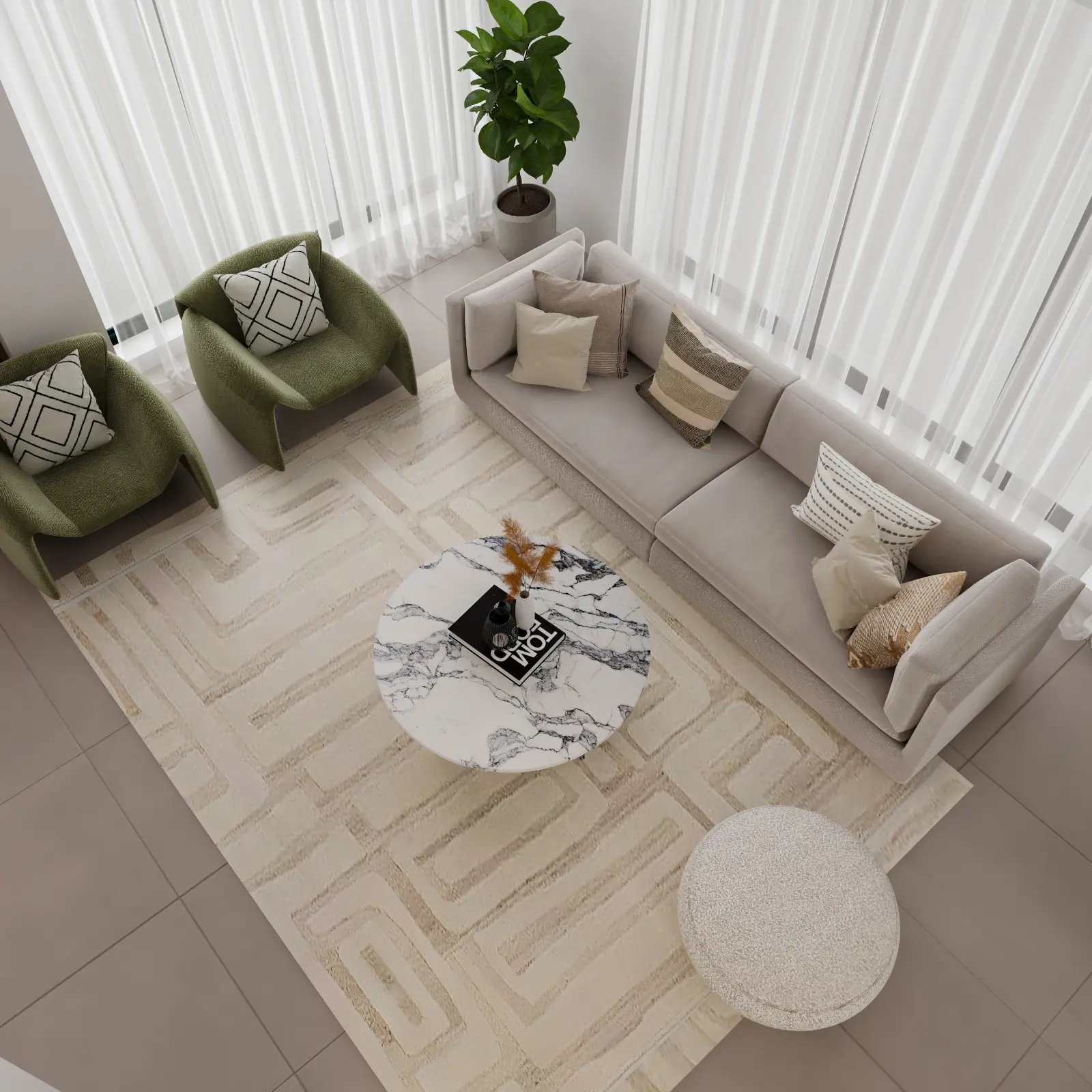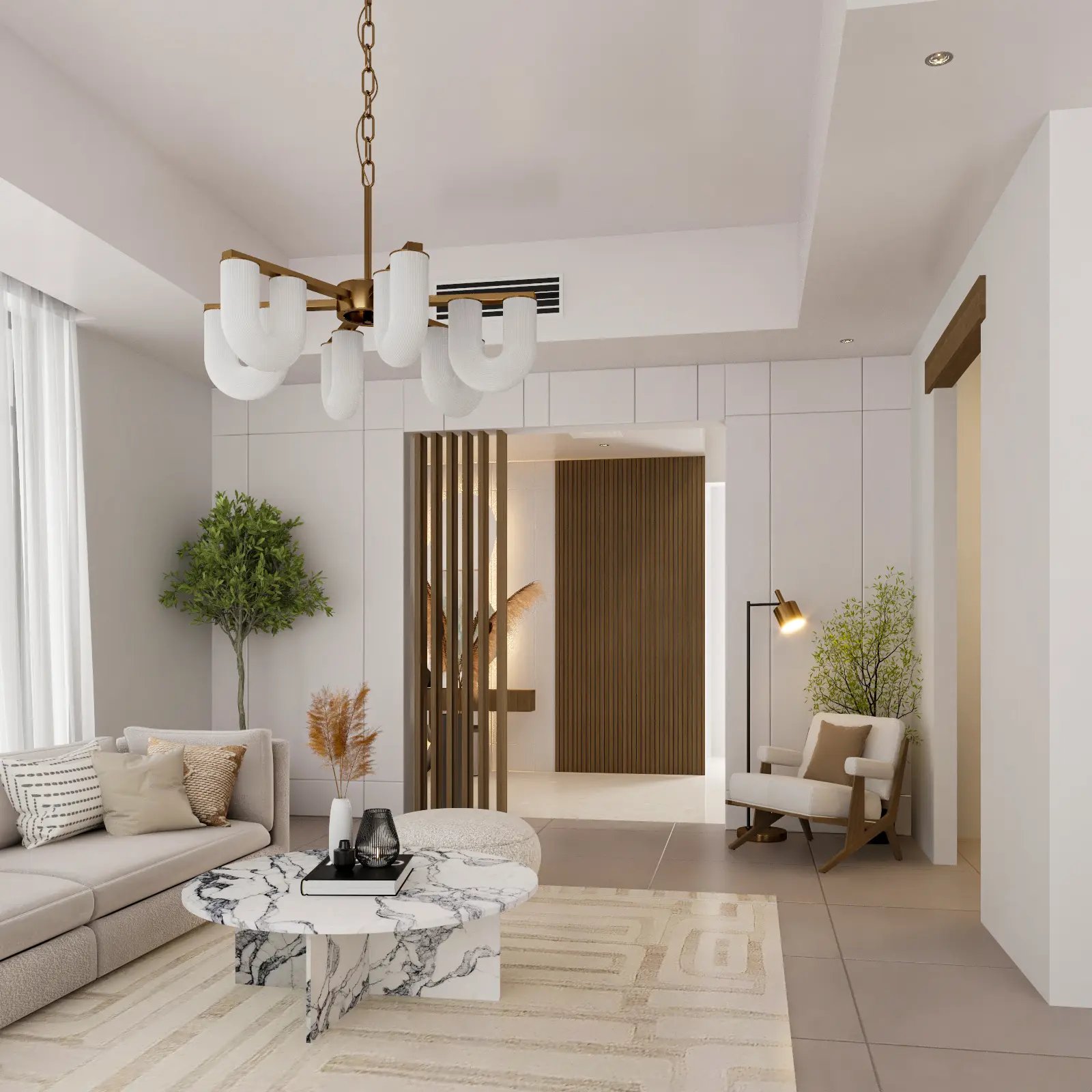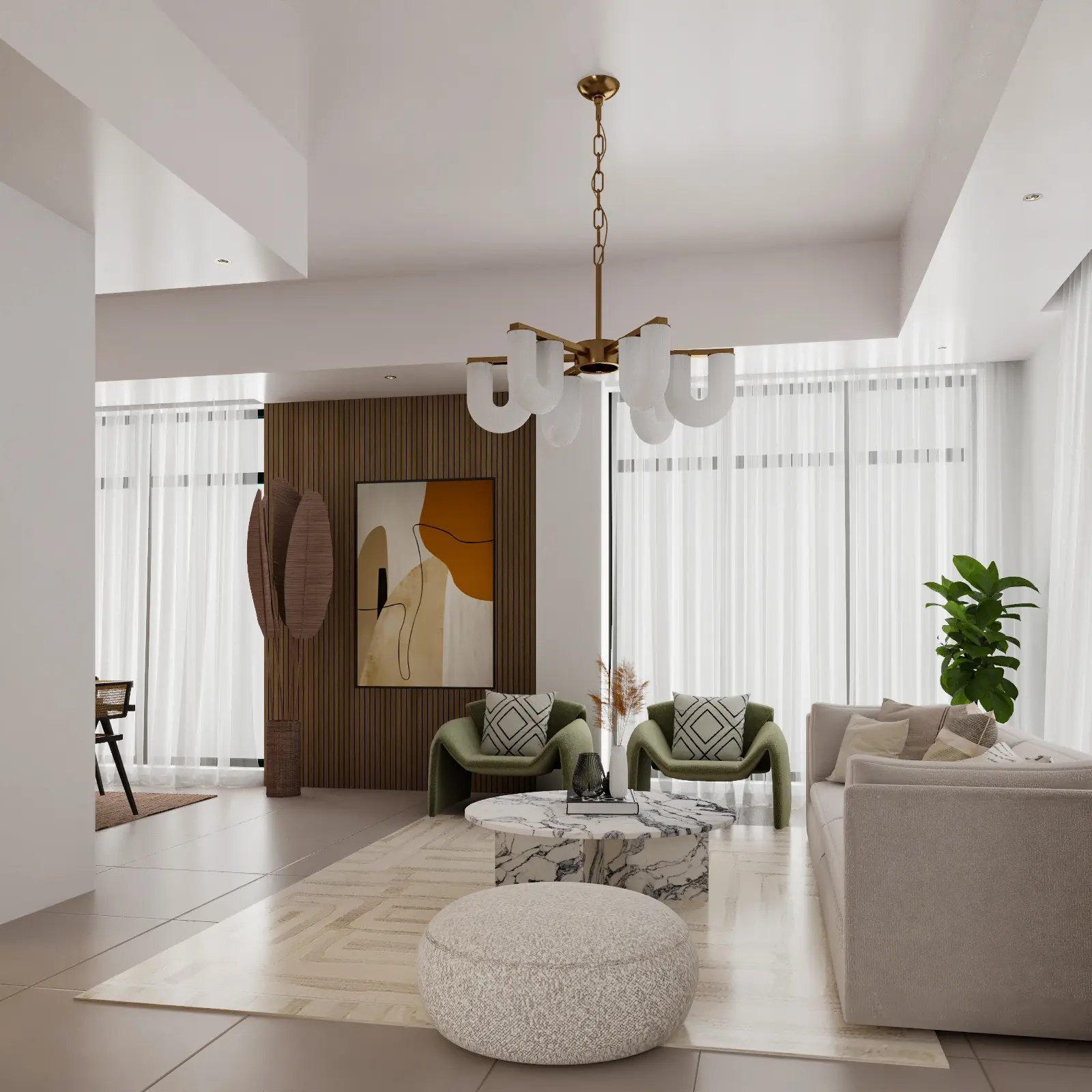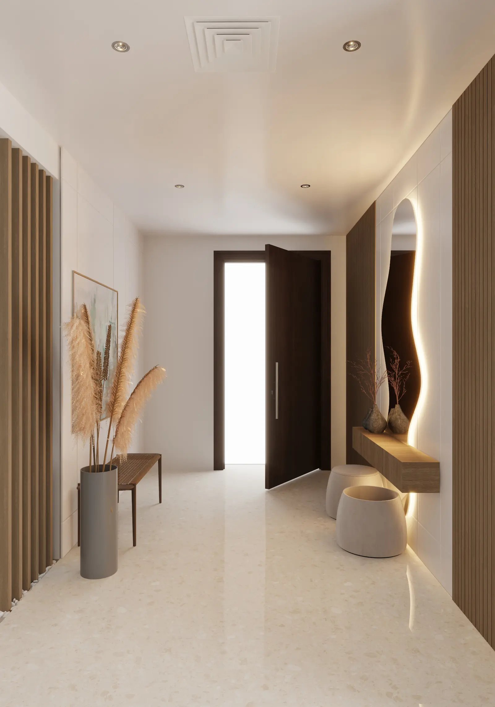 Step into a world of sophisticated minimalism, where natural textures and contemporary design merge seamlessly. This interior showcases an exquisite balance of warm wood tones, neutral palettes, and thoughtfully curated décor that enhances both functionality and aesthetic appeal. Welcoming yet refined, the entryway sets the tone with a curated mix of natural textures and contemporary art. A fluid-shaped backlit mirror becomes an artistic focal point, complemented by sleek paneling and a floating wooden console. A statement slatted wood accent wall with an arched design adds depth, while organic-shaped pendant lights cast a soft glow, creating an inviting atmosphere for gatherings in the dining area. An airy and inviting living room bathed in natural light, this space is designed for both relaxation and conversation. A neutral-toned sectional pairs effortlessly with deep green accent chairs, adding a pop of nature-inspired color. Each space in this interior is designed with a keen eye for detail, ensuring a seamless blend of modern aesthetics and timeless comfort