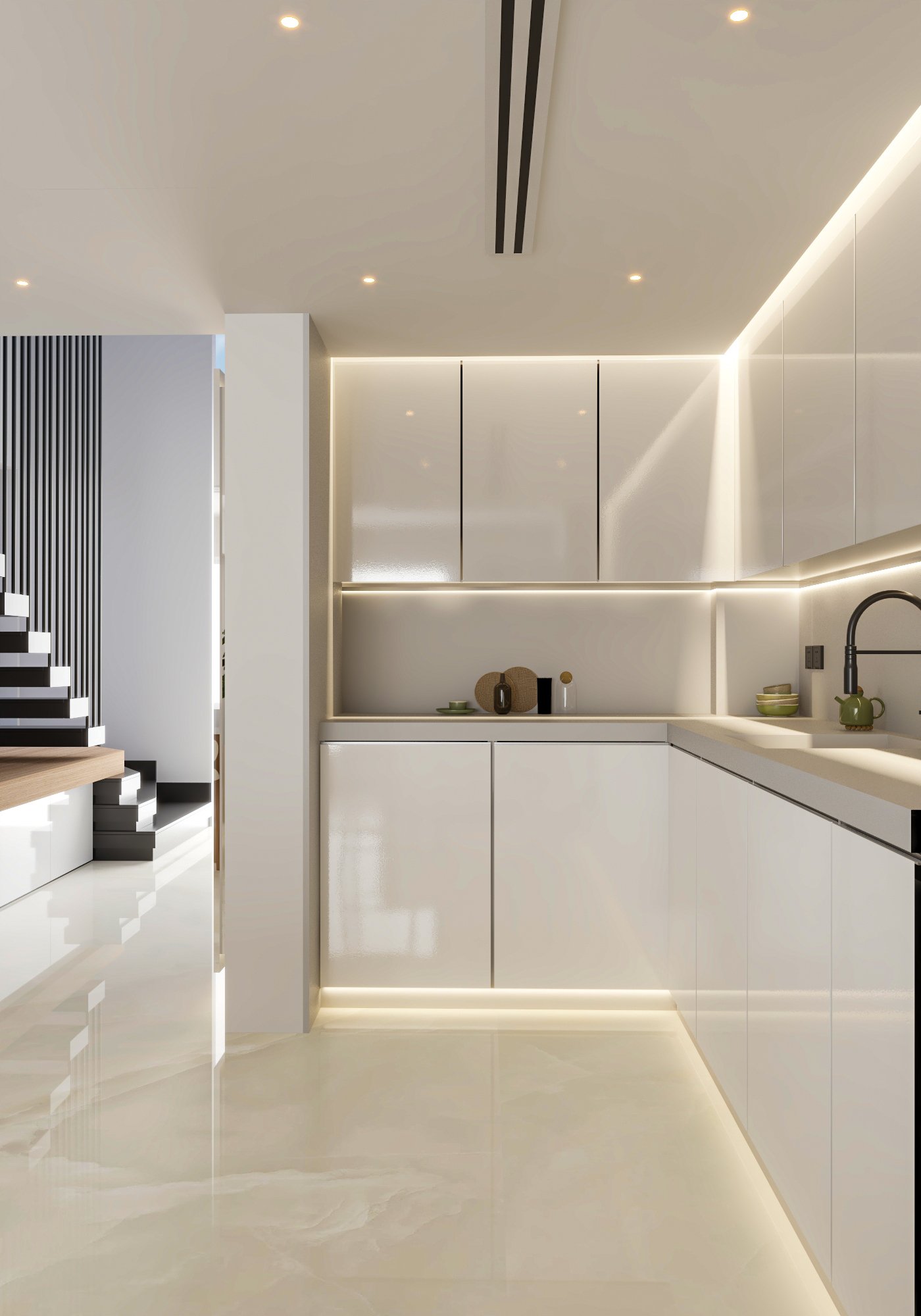 cabinetry, integrated appliances, and understated lighting create a calm,