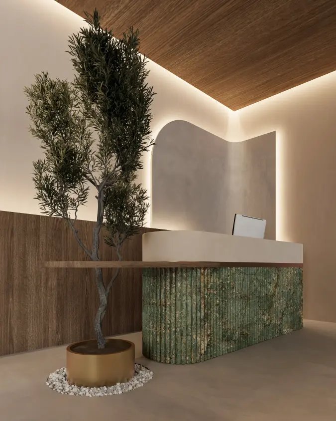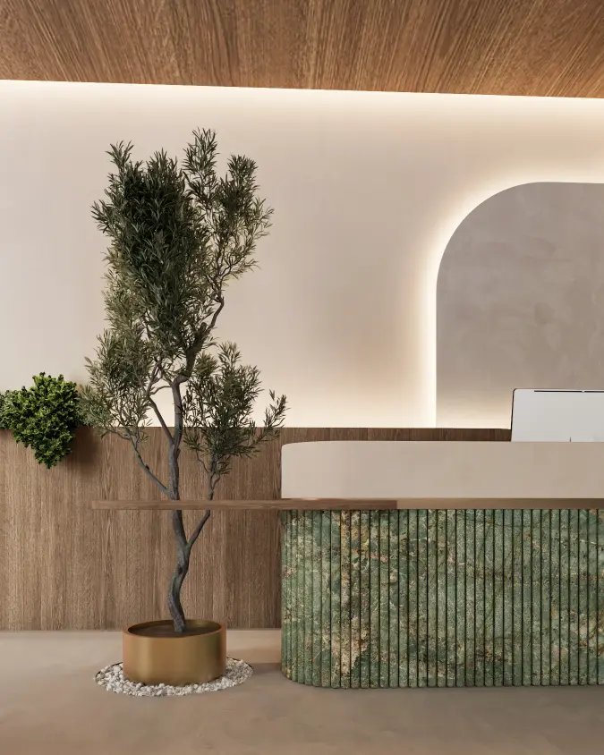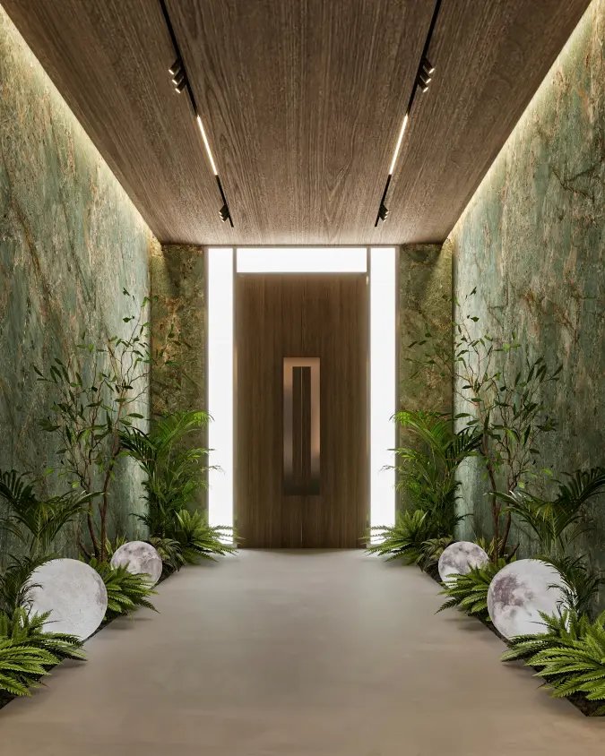 indirect lighting, biophilic elements, and organic materials transforms this space