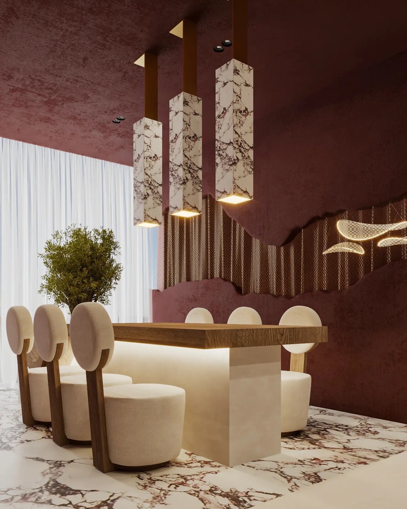 This restaurant gave us the perfect opportunity to play with materials and colours. The luxurious interior space features a harmonious blend of modern and organic elements, creating a warm and sophisticated atmosphere. The dominant color palette consists of rich burgundy hues, complemented by neutral tones of cream, wood, and marble accents. We have designed the dramatic feature wall which features an artistic undulating design with perforated metal details, adding elegance and intrigue. The overall atmosphere encourages cozy and relaxed dining moments with an opportunity to connect. The especially designed ceiling adds contrast and brings a feeling of lightness and fluidity to an otherwise dramatic space. It becomes a space which adds a poignant value to the entire dining experience.