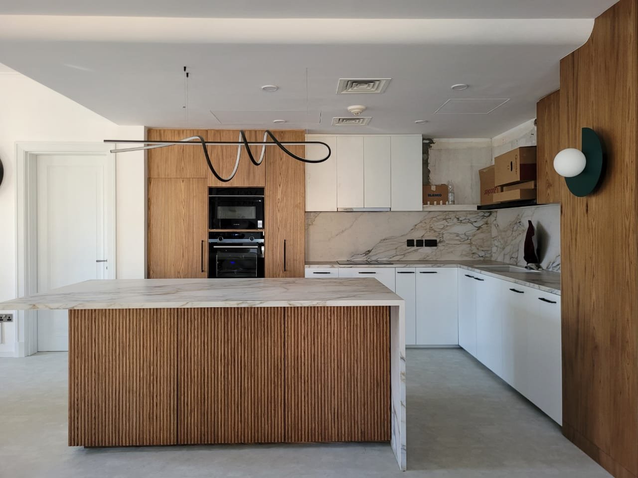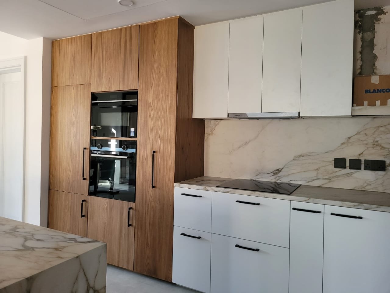 We executed a comprehensive kitchen renovation and designed a compact office space for a client in JLT. The kitchen featured custom-built cabinets with soft-close hinges, integrated appliance fittings, and optimized storage solutions. For the office, we created a functional layout with ergonomic workstations, efficient lighting, and tailored cabinetry to maximize productivity in a limited area.