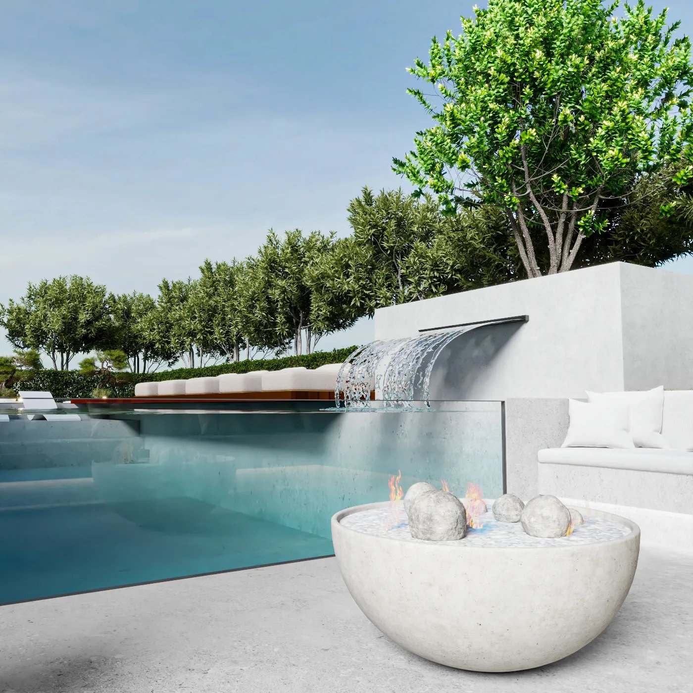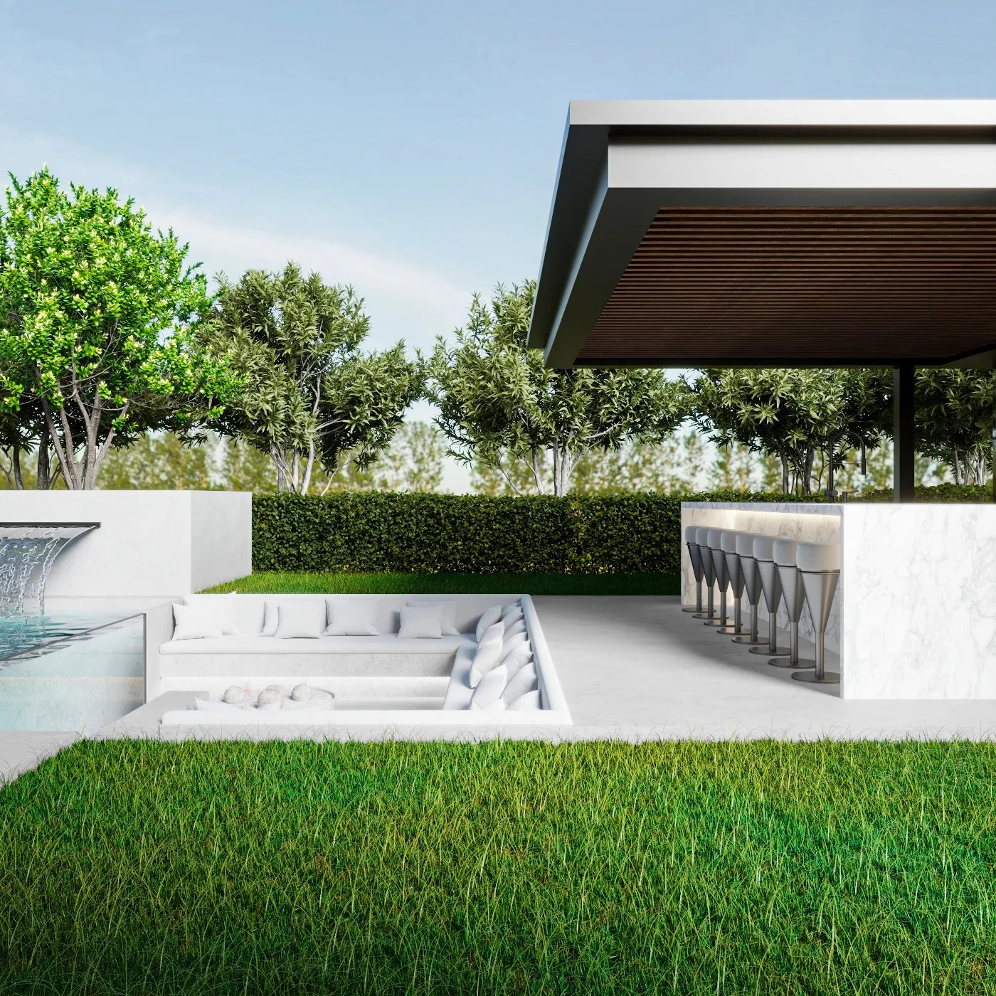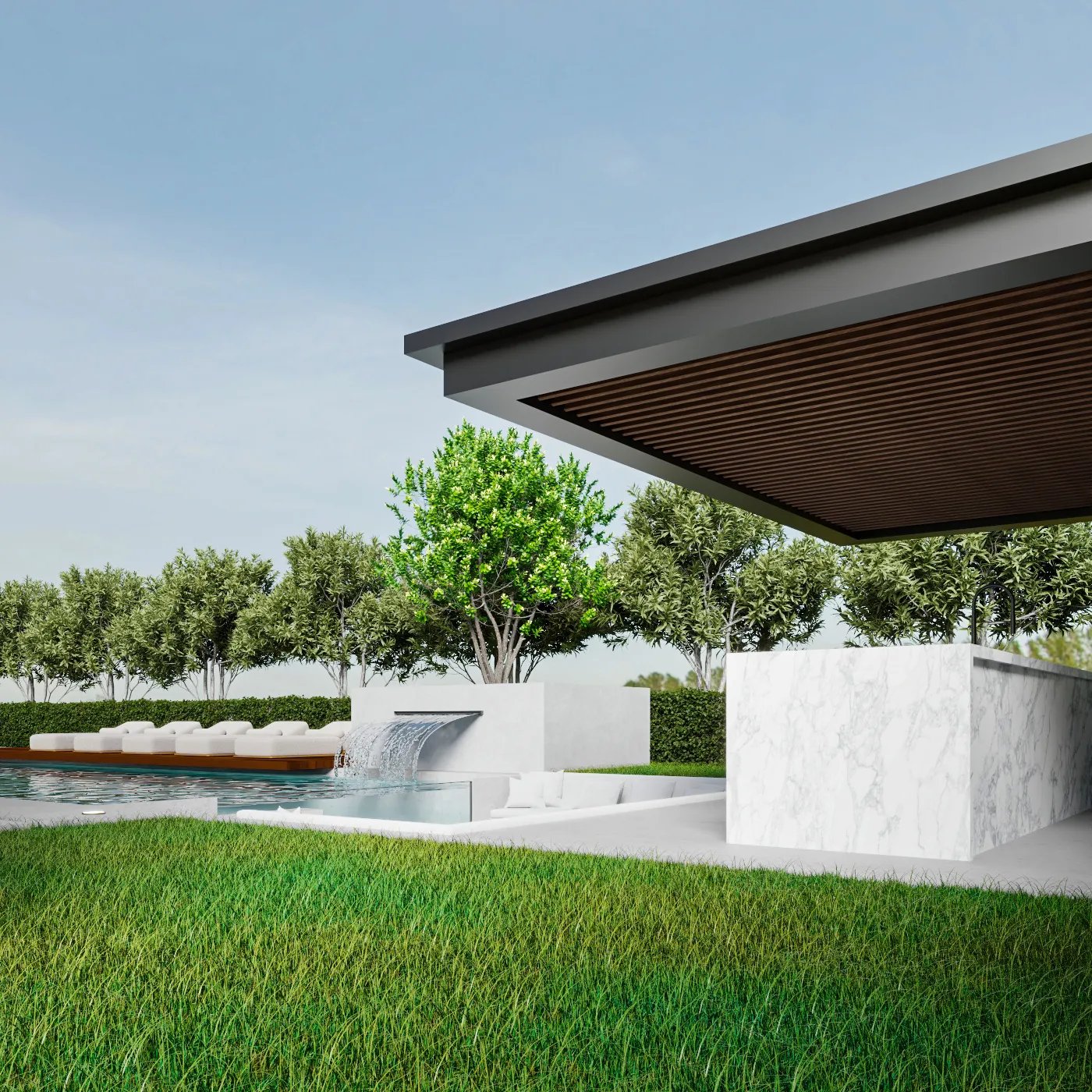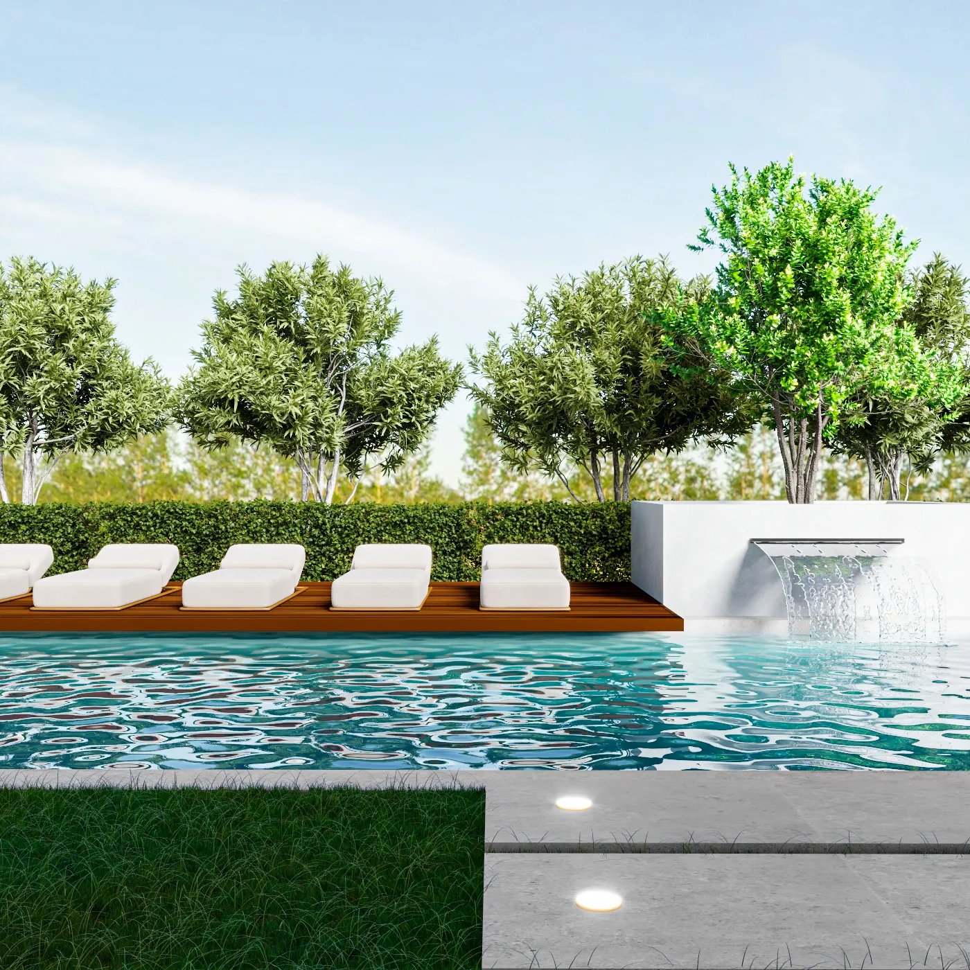 This landscape project is designed to redefine outdoor luxury with a serene and stylish poolside retreat. This beautiful outdoor space combines the best of nature and modern design to create a luxurious poolside retreat. The centerpiece is a stunning pool with a sleek waterfall, surrounded by elegant wooden decking and plush lounge seating. The area is nestled among lush greenery and neatly trimmed hedges, blending modern style with natural beauty. Soft lighting adds to the peaceful ambiance, making it ideal for relaxing during the day or enjoying gatherings in the evening. This project turns outdoor living into a masterpiece of comfort and sophistication.
