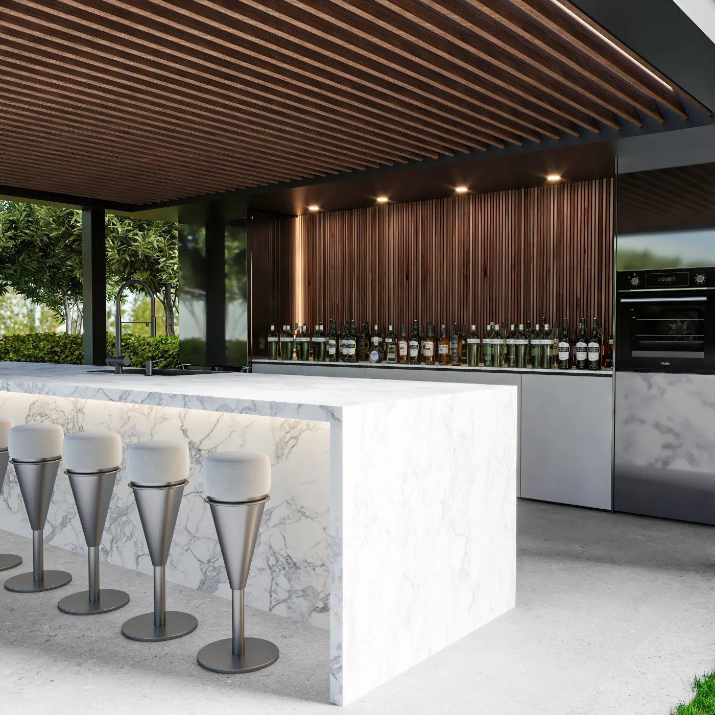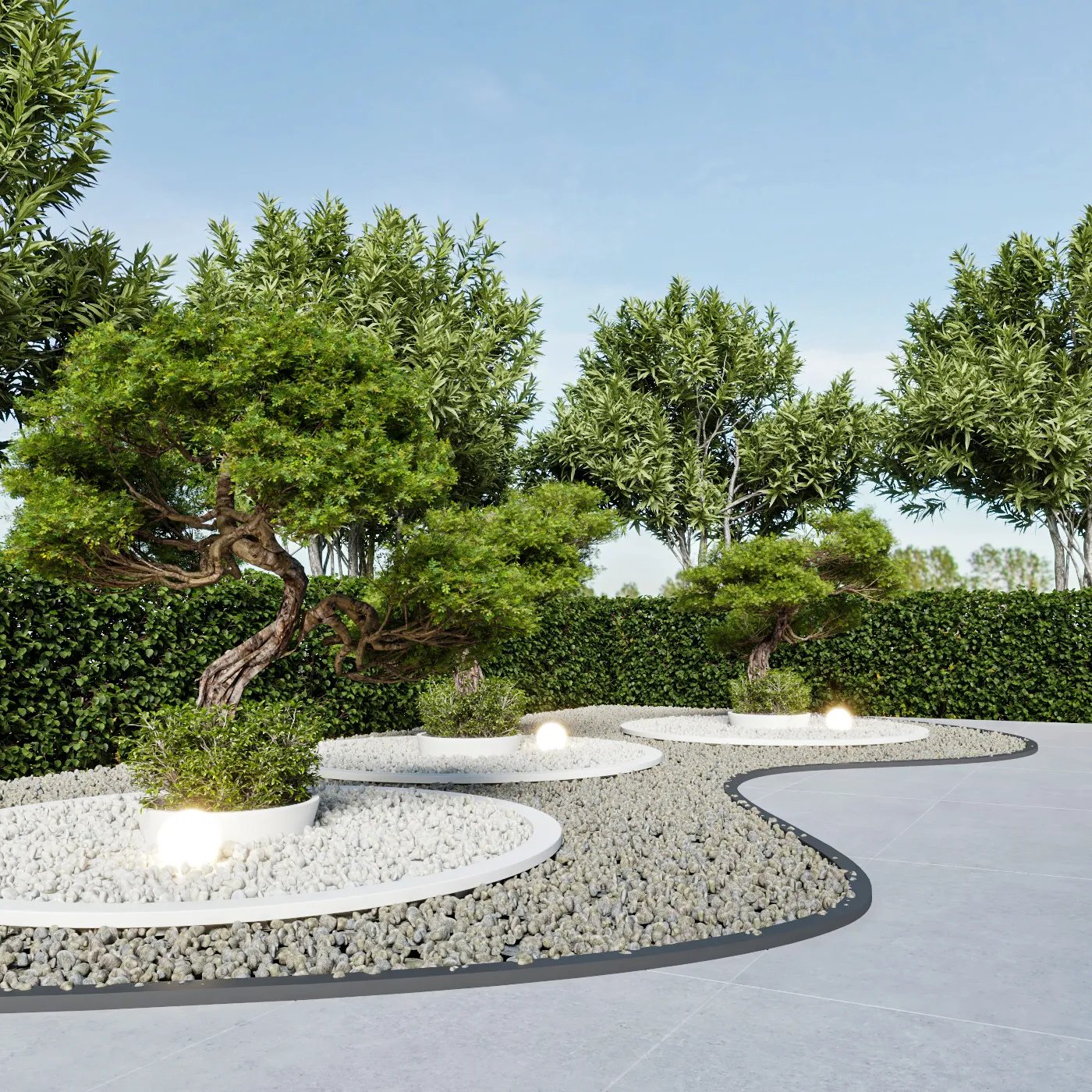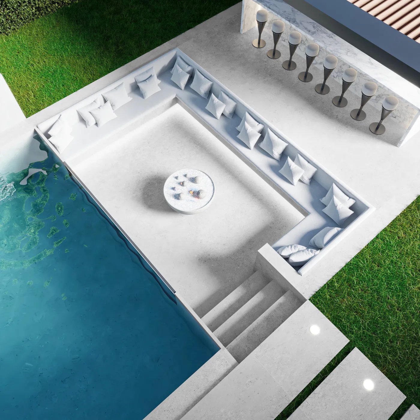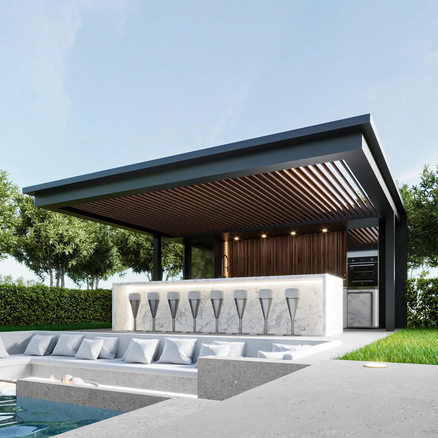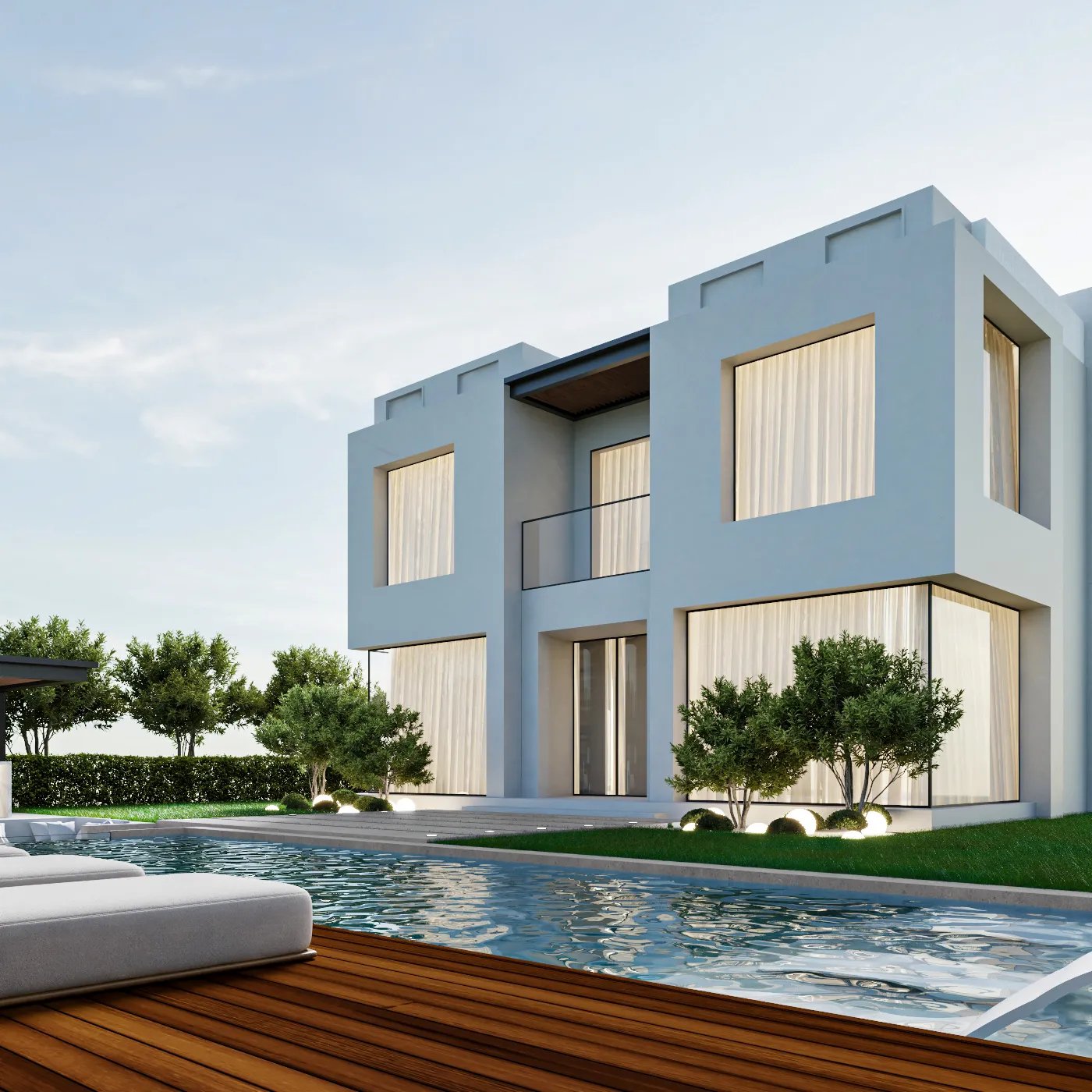 This landscape project is designed to redefine outdoor luxury with a serene and stylish poolside retreat. This beautiful outdoor space combines the best of nature and modern design to create a luxurious poolside retreat. The centerpiece is a stunning pool with a sleek waterfall, surrounded by elegant wooden decking and plush lounge seating. The area is nestled among lush greenery and neatly trimmed hedges, blending modern style with natural beauty. Soft lighting adds to the peaceful ambiance, making it ideal for relaxing during the day or enjoying gatherings in the evening. This project turns outdoor living into a masterpiece of comfort and sophistication.